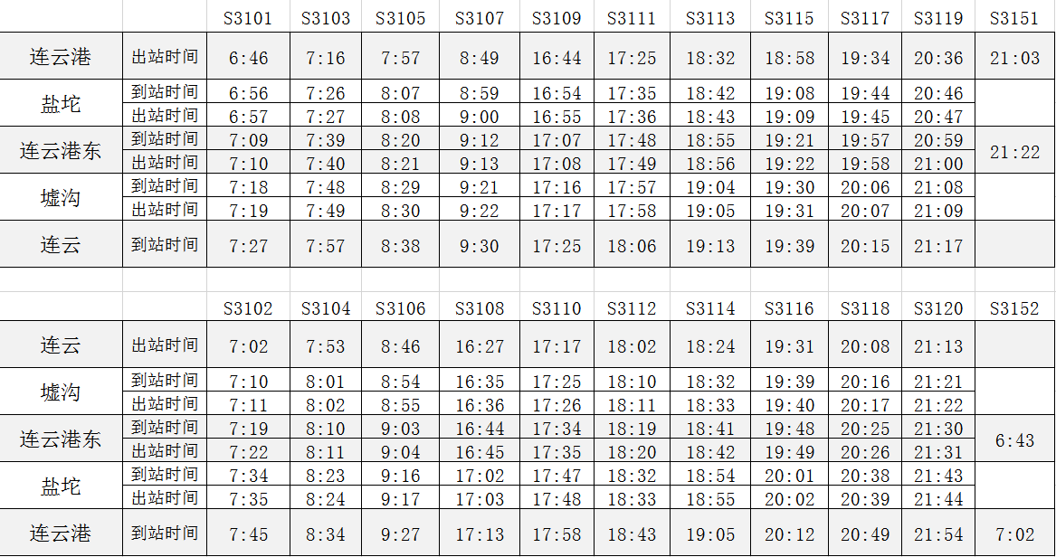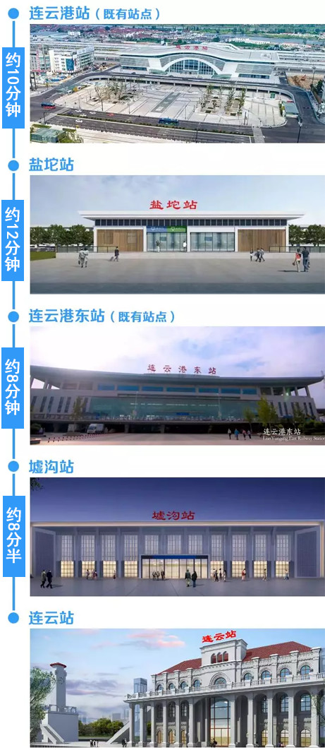市域列车一期工程连云港站至连云站,线路全长35.1公里,沿线设置连云港、盐坨、连云港东、墟沟、连云共5个客站。开通运营后,市域列车每日有11对列车对开,10对在连云港站至连云站区间运行,1对在连云港站至连云港东站区间运行。