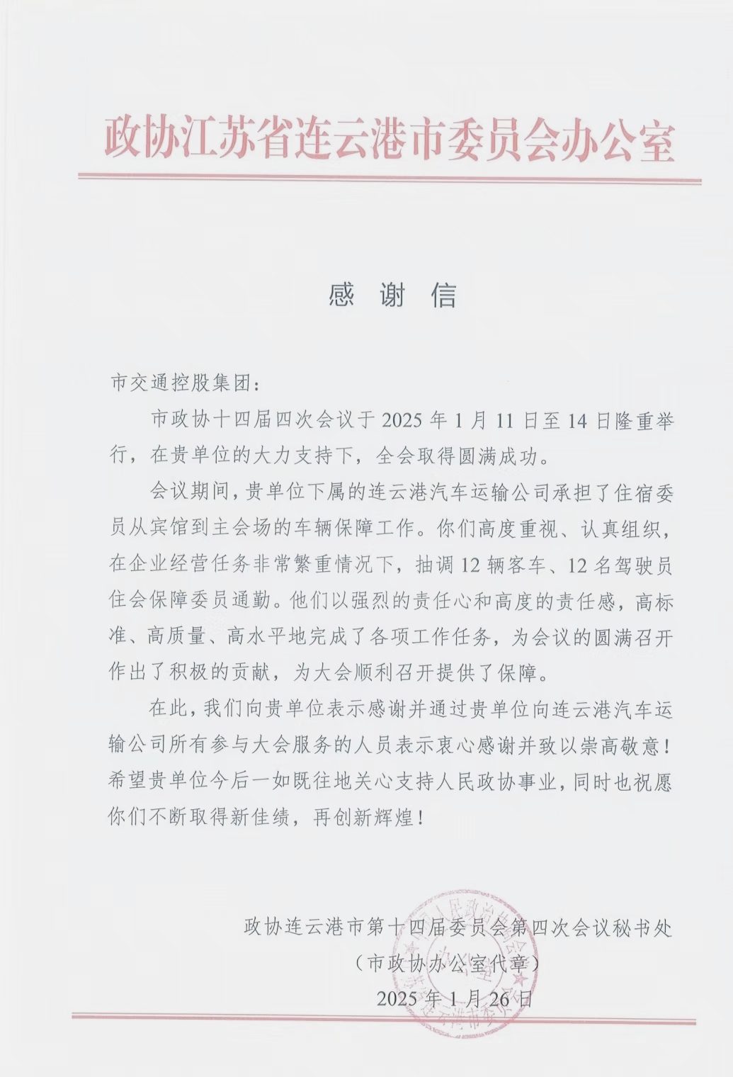 政协连云港市第十四届委员会第四次会议秘书处在感谢信中,不仅向市交通控股千亿(中国)有限千亿官方网页版所属的连云港汽车运输有限千亿官方网页版表达诚挚谢意,还向所有参与服务的人员致以崇高敬意。