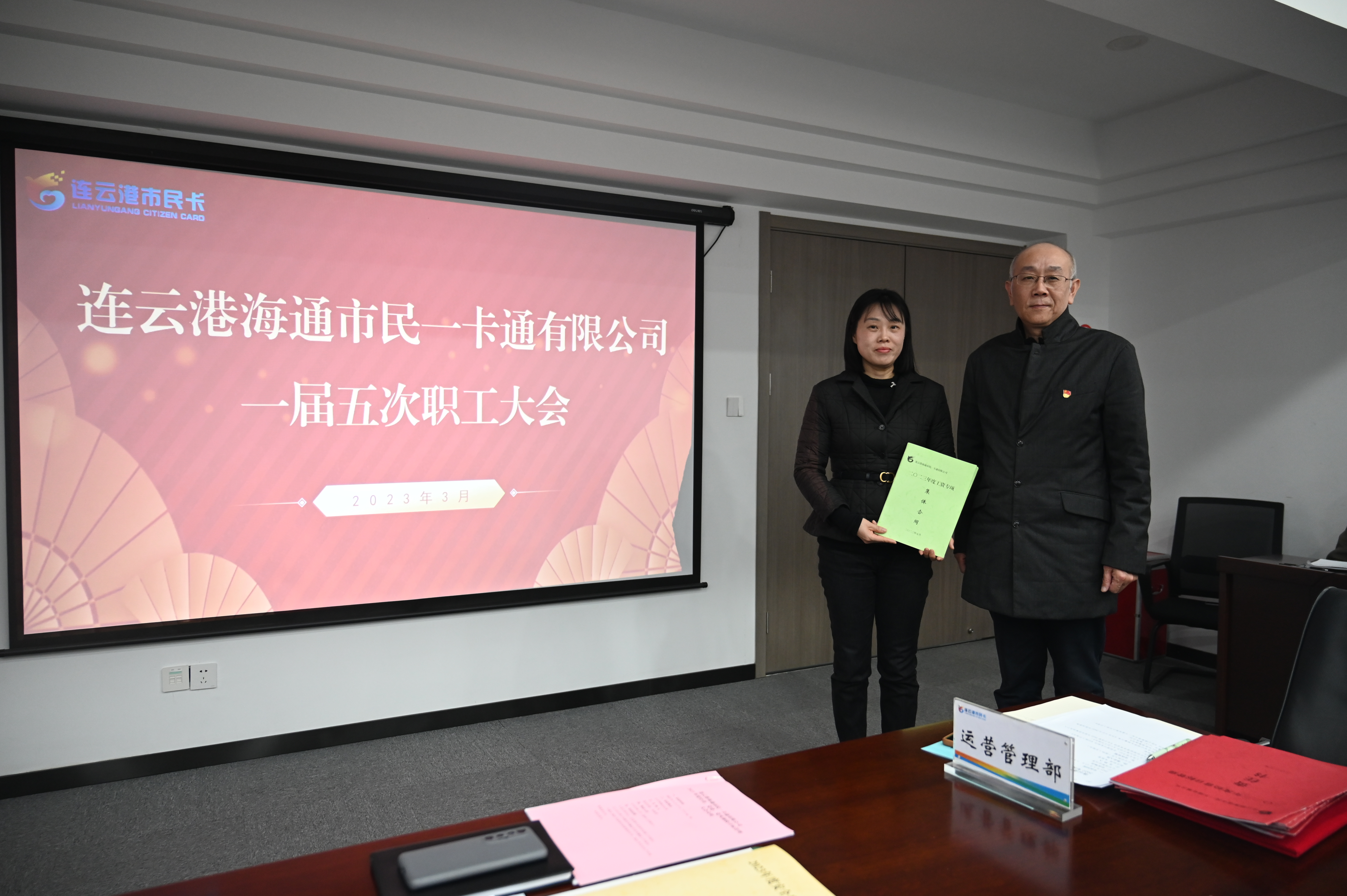 会议审议通过了《2022年度工作报告》《2022年度工会工作报告》《2022年度决算报告暨2023年度预算报告》《连云港海通市民一卡通有限千亿官方网页版职工手册》,工会主席王冰向千亿官方网页版党支部书记、总经理叶星妍递交了市民卡千亿官方网页版《“1+3”集体合同》。