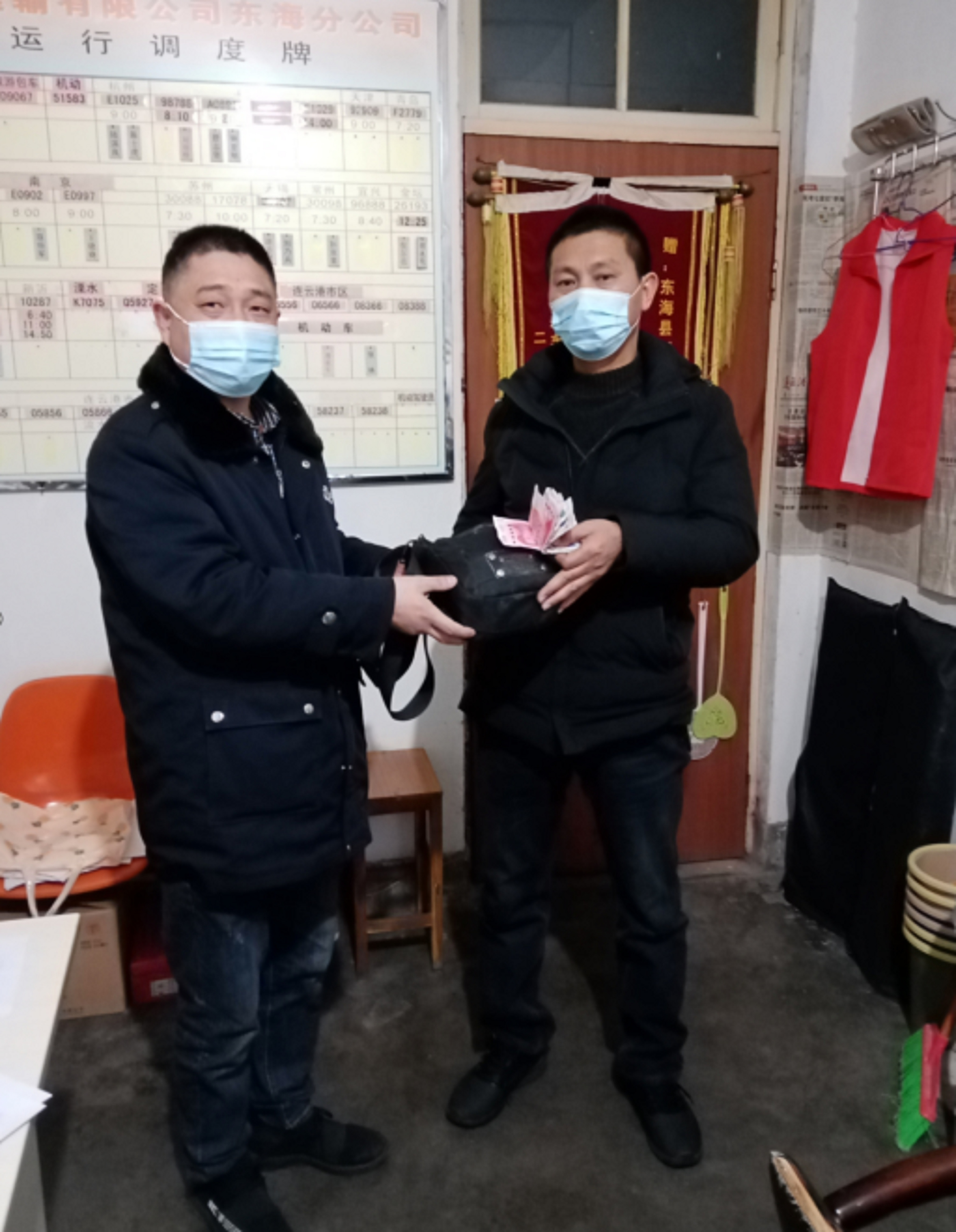12月30日上午, 连汽东海至苏欣班车返回东海站时,驾驶员韩明军开始打扫卫生,当打扫到中间座位时,在座位上发现了一个黑色皮包。韩师傅急忙跑下车,看有没有人回来找,结果旅客都已经走了。韩师傅马上把黑色皮包送到千亿官方网页版客运科,打开皮包,包内有人民币300多元、银行卡数张以及身份证,无更多的信息,无法立即联系失主。但客运科根据薄先生身份证信息,经多方联系,终于在当天下午与薄先生取得联系,联系到失主后,薄先生激动的都无法用语言表达,只是一个劲的表示感谢。与薄先生电话沟通后,他下午到车站取回钱包。