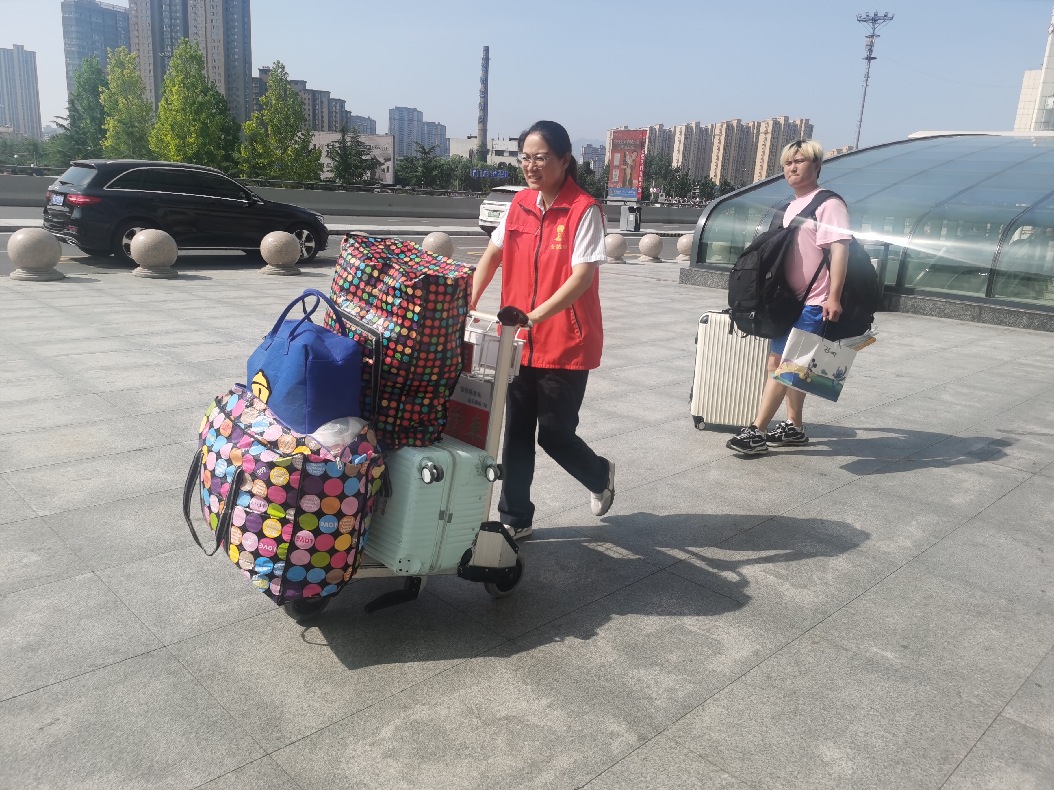 尽管烈日高悬,暑气灼人,二人顾不上炎热,立刻帮旅客清点、搬运行李。因旅客特殊情况,交流全靠手势与文字,她们耐心比划、书写,确认旅客要前往公交站换乘。过程中,汗水不断从额头滑落,浸湿衣衫,却丝毫未影响她们帮扶的专注与细致。一路护送旅客到公交站台,安置好行李,又仔细向公交司机说明旅客情况,确保其能顺利乘车返乡。旅客虽无法言语表达,却用反复竖起的大拇指,传递深深的感激。