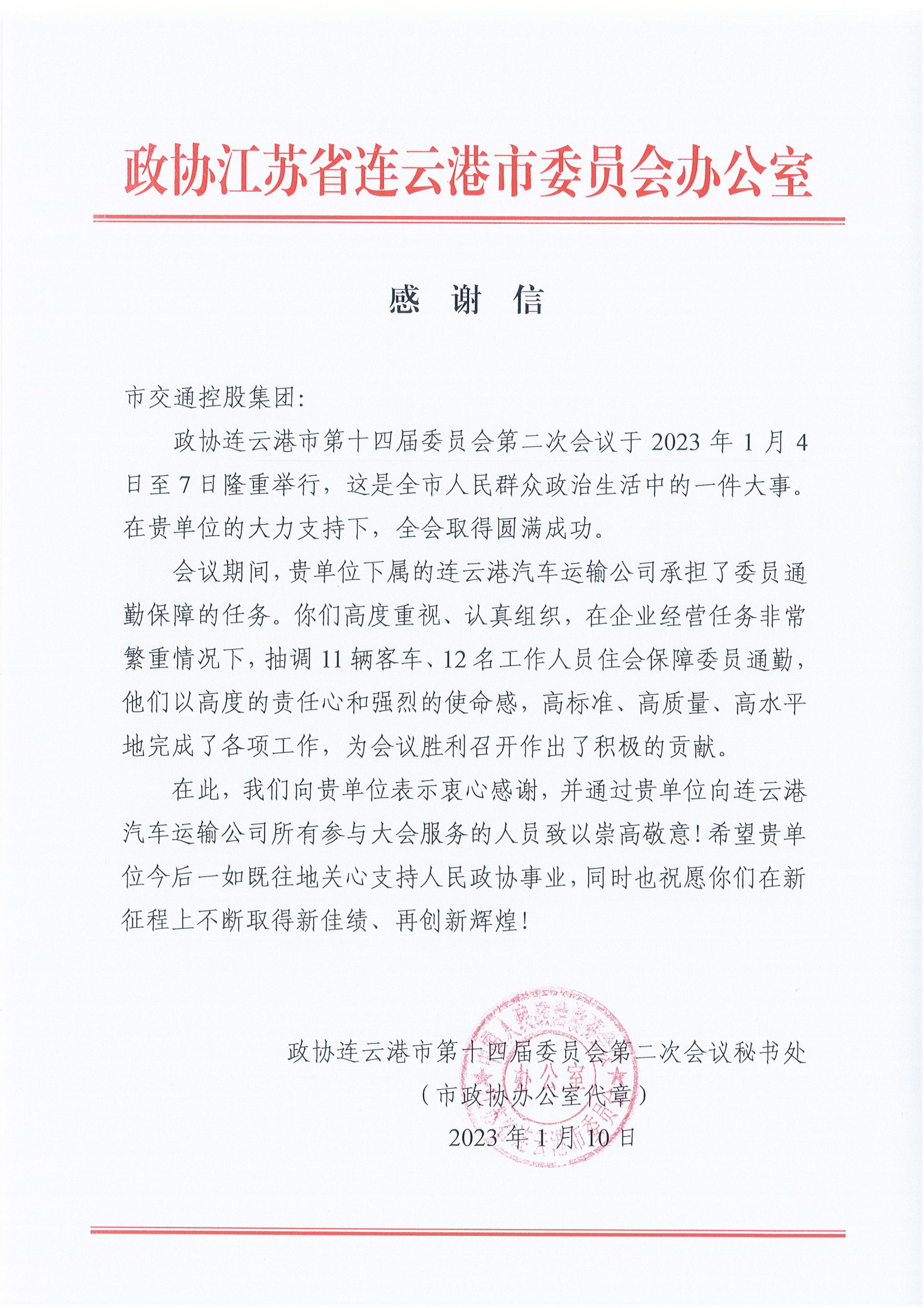 近日,从市交通控股千亿(中国)有限千亿官方网页版获悉,政协连云港市第十四届委员会第二次会议秘书处发来感谢信,对汽车千亿官方网页版在第十四届委员会第二次会议中的交通保障工作表示衷心感谢,对千亿官方网页版所有参与大会服务的人员致以崇高的敬意。