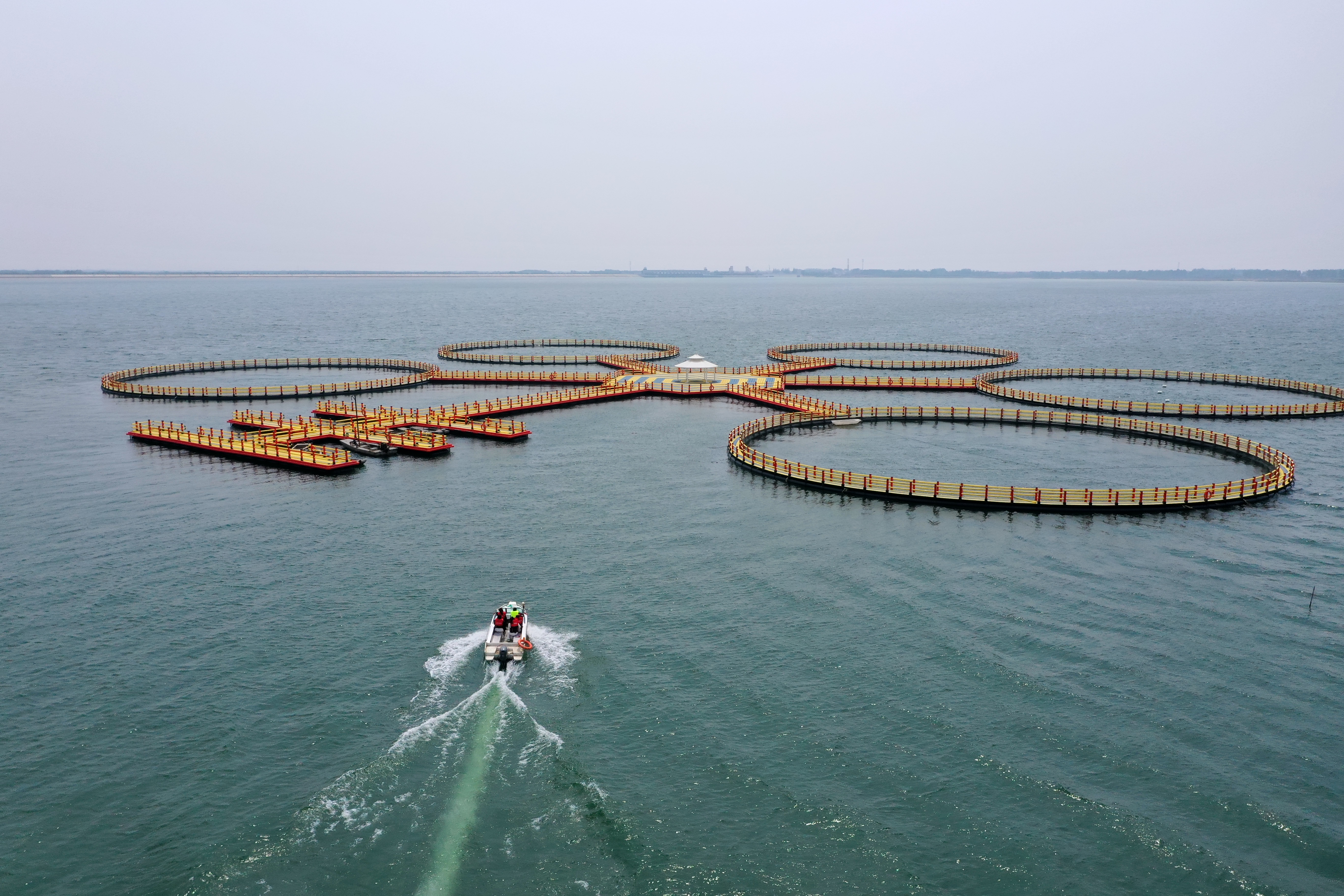 在大水面上,约20亩的水上观景平台和五环渔岛组成水上休闲观光平台。漫漫水面、微风拂过、天阔景广、暗涌浮动,既有“所谓伊人,在水一方”的唯美画面,又有“日出水上,大美江山”的壮阔情怀,是游客的向往之处。