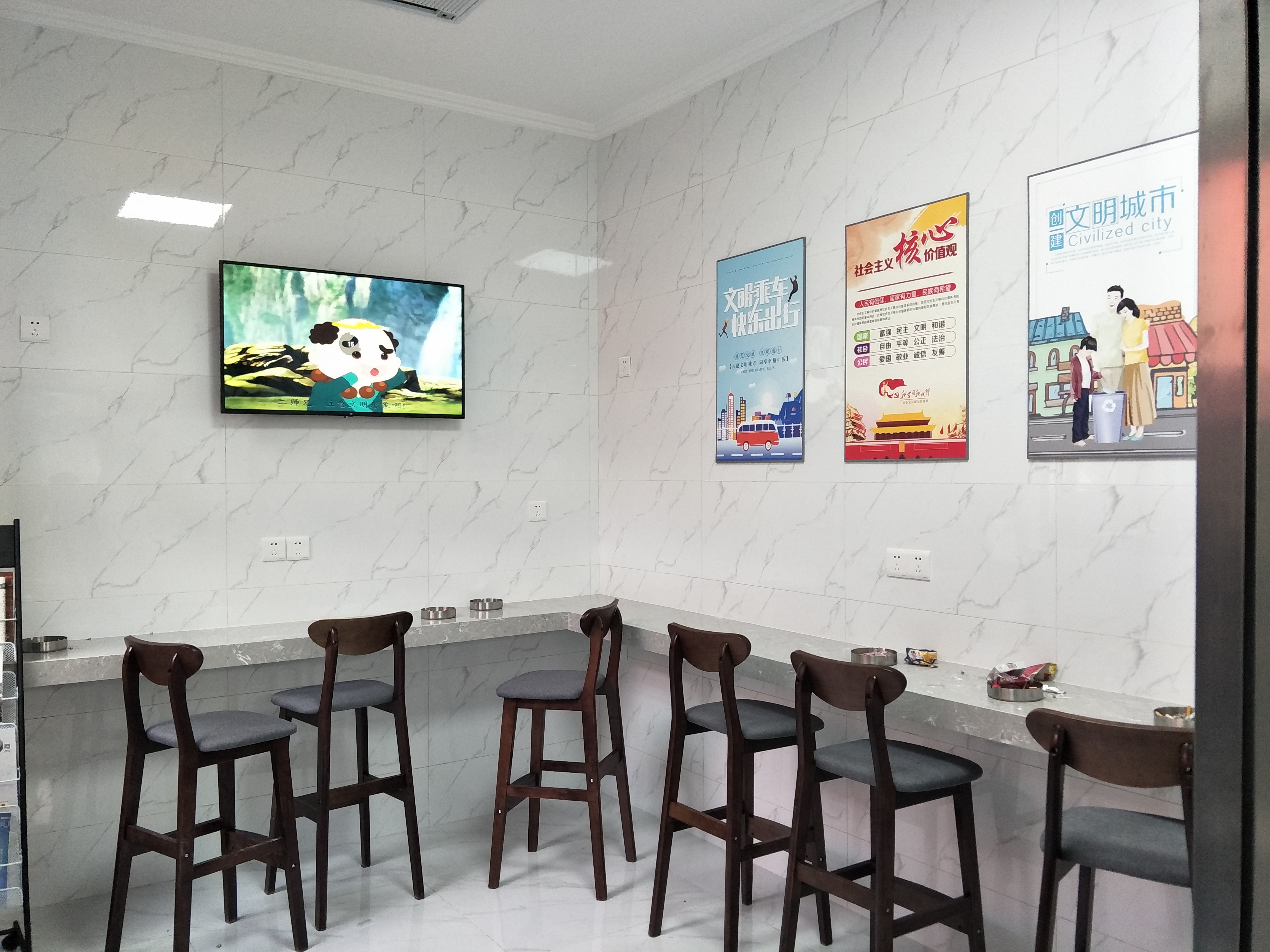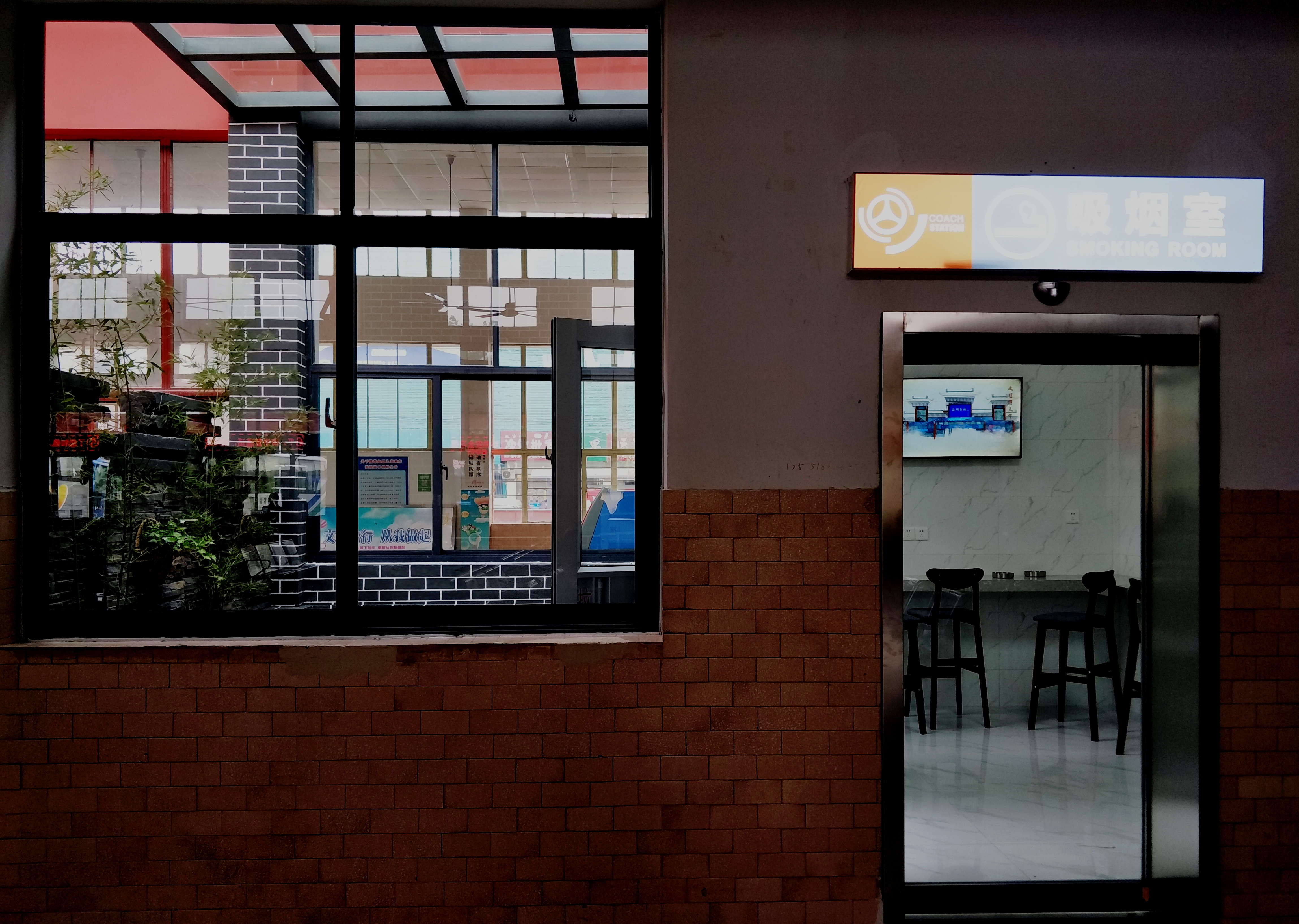 改造后的吸烟室设有两间,一间配备有玻璃自动感应电动门,使用方便,密闭性能好,有效的改善了抽烟时产生的有害物质外泄。液晶电视屏上滚动播放绿色出行动画,墙上悬挂文明乘车的广告宣传展板,营造文明吸烟环境。另外一间设置了观景台,顶部有一个镂空的出风口,通风顺畅,解决了二手烟的污染问题,完整独立的绿色净化空间,能给吸烟者一个清净的吸烟场所,同时考虑到安全问题以及旅客需求,安装了智能点烟器,清洁人员也会定时定点对吸烟室进行清理,也让乘客们有宾至如归的感觉。