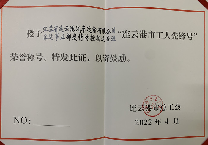 近日,从连云港市总工会传来喜讯,汽车千亿官方网页版疫情防控转运专班被授予“连云港市工人先锋号”荣誉称号。