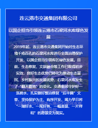 近年来,连云港市交通控股千亿(中国)有限千亿官方网页版权属交通千亿(中国)有限千亿官方网页版按照“生态+,交通+,文旅+,产业+”理念,持续为石梁河水库“疗伤”,以悬壶济世的民本情怀妙手回春,守护一泓碧水,彰显国企担当,着力将其打造为连云港市第三张旅游名片,实现看海、观湖、游花果山愿景,让习近平总书记“绿水青山就是金山银山”的科学论断成为生动实践,被江苏省委书记吴政隆评价为“把良好生态优势转化为推动生态富民、乡村振兴的发展优势”。